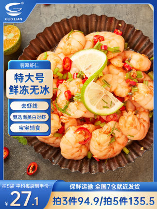 天猫GUOLIAN官方旗舰店46.3元,下单3件可领138-49元优惠券,实付89.9元到手。国联水产翡翠生虾仁加大号,虾仁头尾相接情况下直径约4.2cm,每200g虾仁个数10~14个。优选鲜虾活虾,去壳去虾线,口感弹嫩鲜滑爽口,营养丰富。