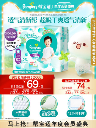 【拍1件到手69元】帮宝适官方旗舰店!3D绵柔泡泡表层,0.25cm超薄空气芯,透气不闷热,让小屁屁四季如春,超能吸不易反渗,12小时保持干爽,腰围腿围双重防漏!