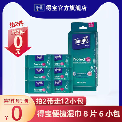 医护级产品认证,Tempo 得宝 mini卫生洁肤湿巾 8片*6包*2件19.9元包邮(9.95元/件)