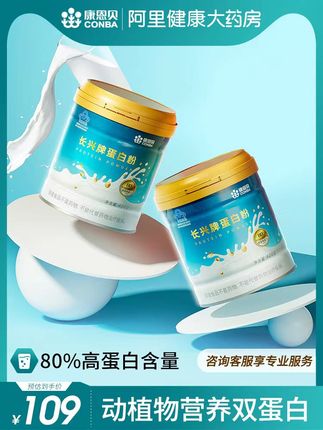 康恩贝 乳清蛋白质粉,国家食品药品监督管理局蓝帽认证,采用新西兰进口乳清蛋白+非转基因大豆分离蛋白,双蛋白配方科学比例,阿里健康大药房109元,可领40元优惠券,实付69元到手