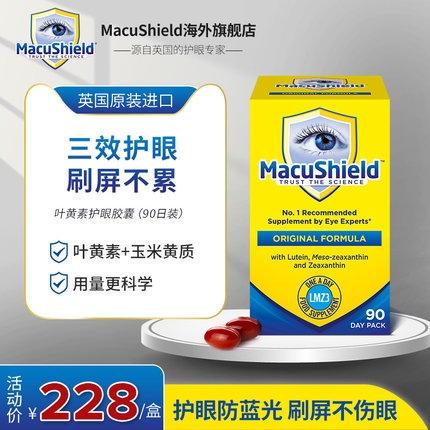 基本持平之前30粒装的白菜价,而且已咨询客服,非临期,页面产期未更新!抵御蓝光、三效合一,呵护眼部健康,缓解眼疲劳,目前天猫国际Macushield海外旗舰店售价¥228,可领取¥170优惠券,券后实付¥58包邮包税