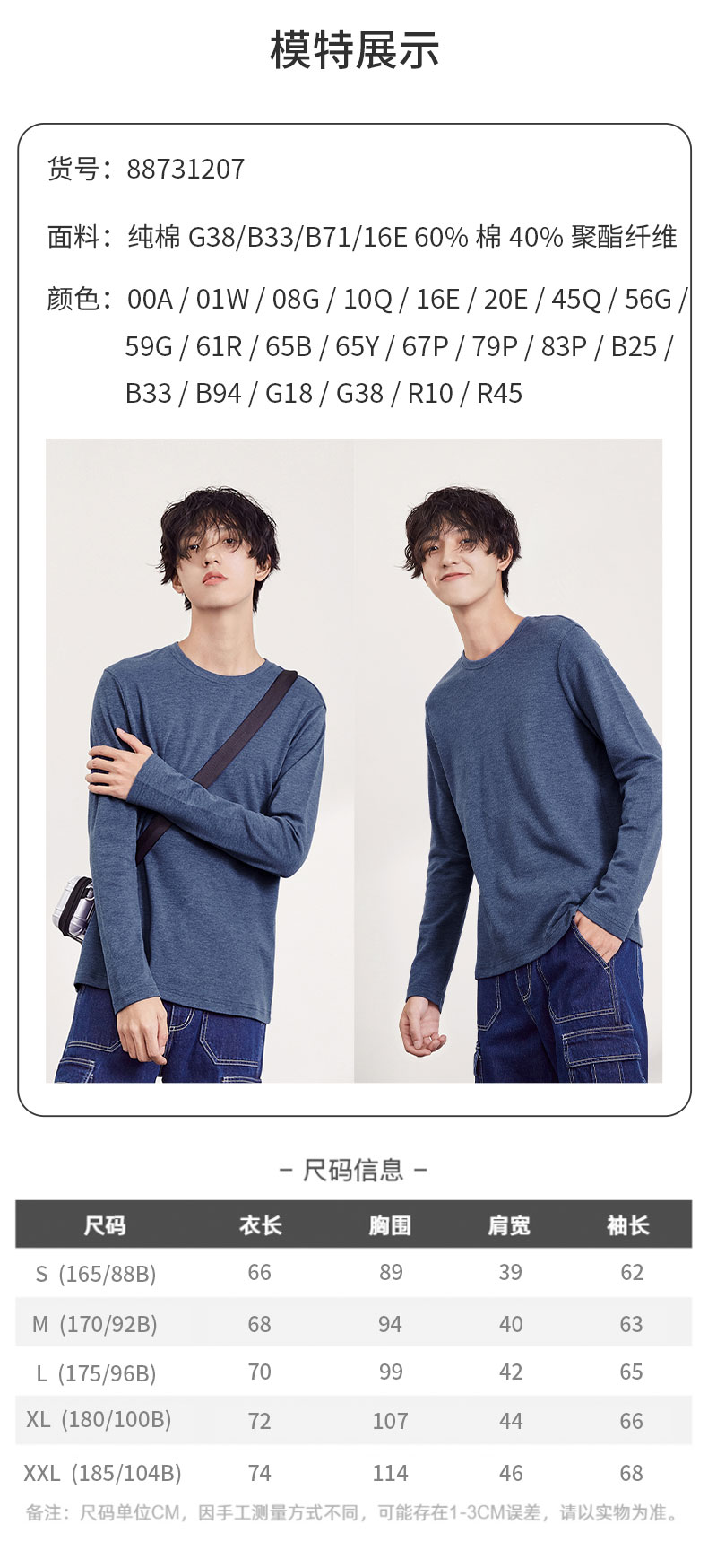 尺码S-XXL,黑色、雾霾蓝、深灰、湖蓝等17种颜色可选,男女都能穿。纯色圆领款式,单穿或打底都可,面料亲肤柔软,舒适透气,简约百搭,可以穿三季。 ​