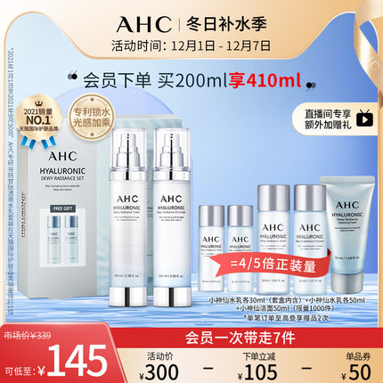 包含:柔肤水100ml+乳液100ml+水乳小样各30ml+赠品,共到手7件。含10重复合多维玻尿酸、研谷胱甘肽、天然植物提取物等成分,主打补水保湿、提亮肤色、平衡水油,清爽不油腻。