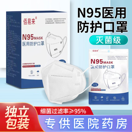 正规国家标准N95医用防护口罩,符合防疫要求的医用防护口罩执行标准:GB19083-2010,五层防护,双层熔喷,高滤低阻。目前天猫商城佳辉医疗器械专营店独立装25只售价¥62.5,可使用¥30优惠券,实付¥32.5包邮。