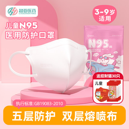 超亚 医疗级别儿童N95医用防护口罩 独立装30枚 赠新年口罩30枚新低49.9元包邮(成人款同价)