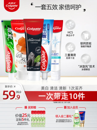 折7.9/支,包含:龙井薄荷、淡雅香氛、防蛀健白、竹炭去渍、小苏打美白5种牙膏,主打清新口气、排浊美白、吸附去渍等不同功效,满足全家口腔护理需求~
