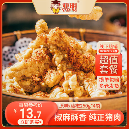 严选农家猪肉,肉质细嫩,根根瘦肉,爽脆留香,“咔呲”一口尽享脆爽。目前天猫商城亚明旗舰店250g*4袋售价¥54.9,可使用¥20优惠券,年货节9折后实付新低¥29.41包邮,降¥5新低,2种口味可选,历史新低价。