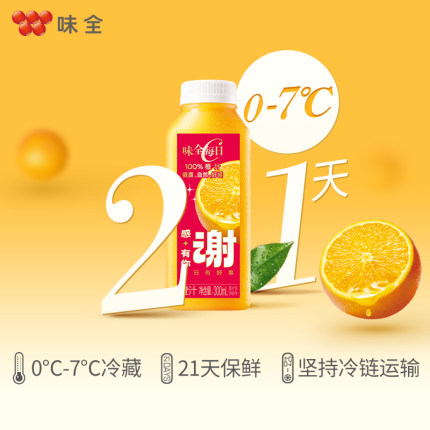 便利店7-8元一瓶,100%纯,低温果汁,锁留营养,0°C-7°C冷藏,21天保鲜,自然美味,香甜如鲜果,全程冷链运输到家。目前天猫商城味全官方旗舰店特价¥89,可领取¥23优惠券,实付¥66包邮,12瓶装,折¥5.5/瓶,橙汁、葡萄汁、胡萝卜汁、桃汁、莓莓桃桃等口味可选。