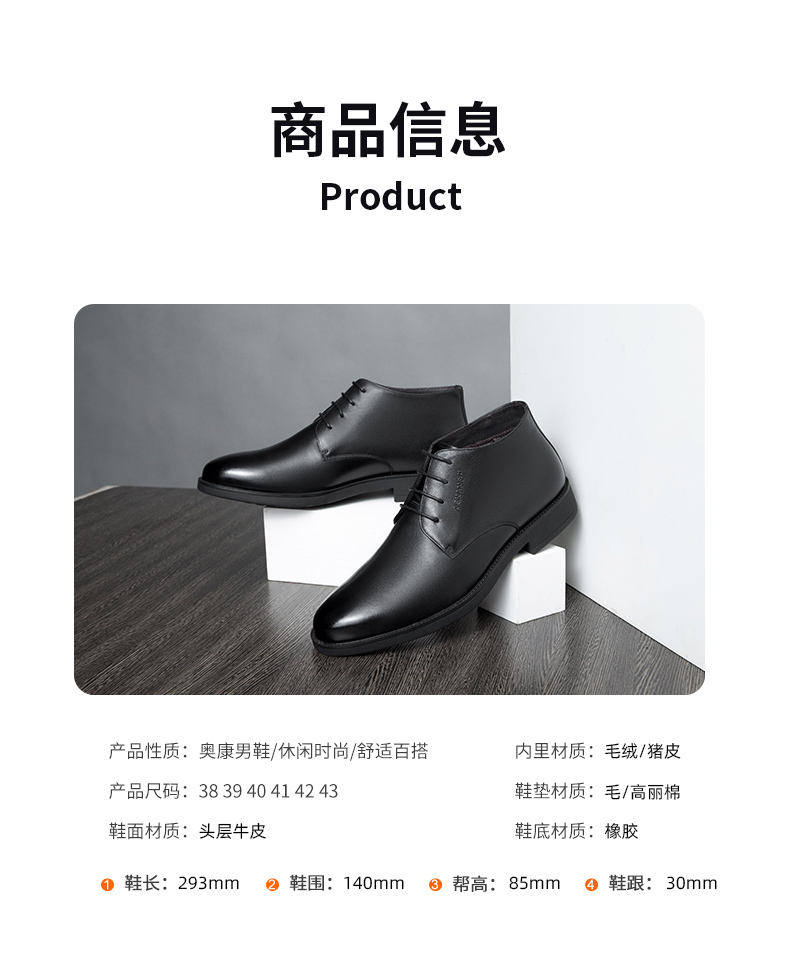 这款奥康 男士真皮高帮加绒皮鞋,采用头层牛皮革材质鞋面,纹理细腻,舒适耐穿,内里为高品质人造短绒毛,恒温保暖,亲肤贴脚,聚氨酯大底,防滑抓地底纹,耐穿耐磨。一脚蹬侧拉链设计,穿脱方便,简约造型,适合各个场合。