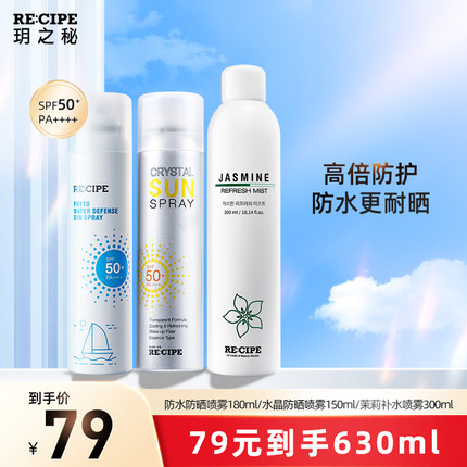 天猫国际RECIPE海外旗舰店特价¥99,领取¥30优惠券,实付¥69包邮包税,到手:防水防晒喷雾180ml*1+水晶防晒喷雾150m*1+茉莉补水喷雾300ml*1,效期至2024-01-18,放心入,超值好价