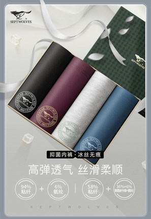 七匹狼冰丝内裤4条装,穿着舒适,亲肤透气,质量很好,洗了也不褪色,品牌内裤就是好。质量好,摸着比较柔软~颜色也是我想要的,弹力大~卫生干净,可以抗菌。4条内内仅35,值得买!
