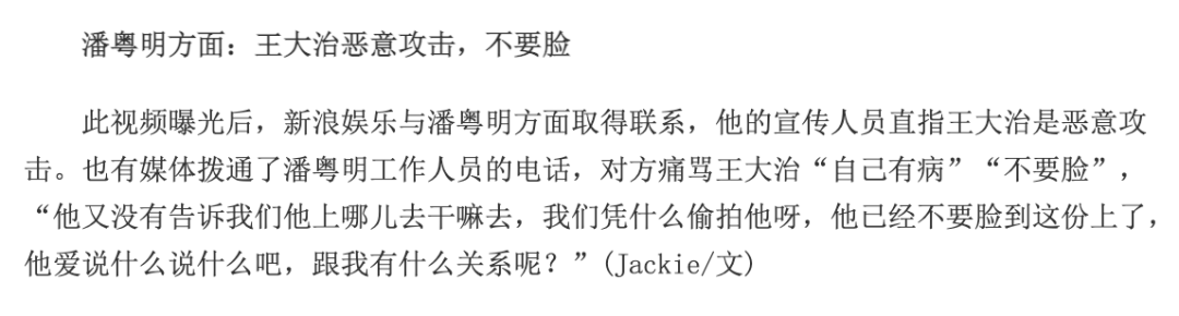 王大治本人接受采访也挺不避讳的,说偷拍是潘粤明指使的,潘粤明经纪人则说他不要脸。