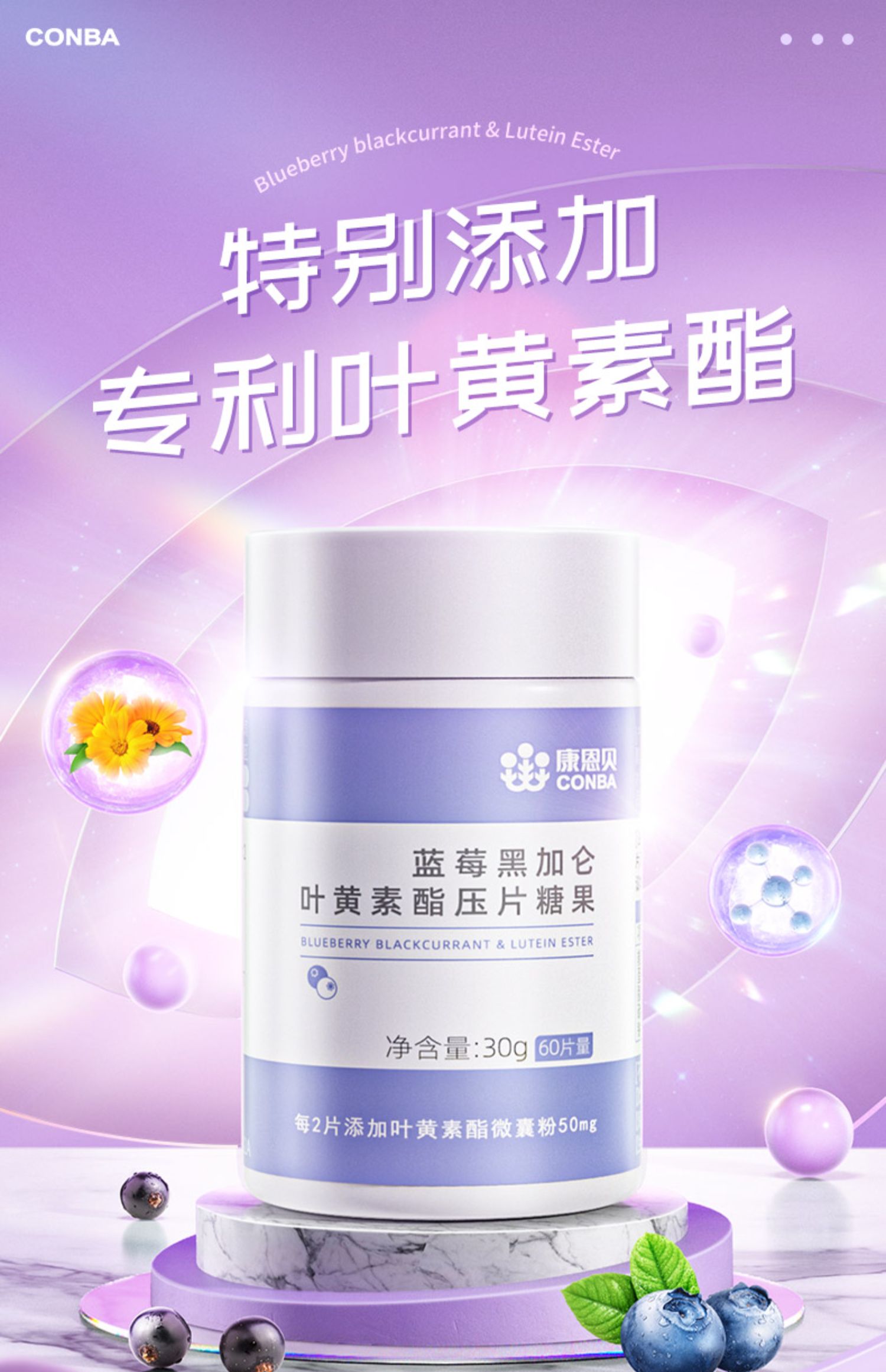 叶黄素是一种存在于蔬菜水果里的天然类胡萝卜素,俗称”眼黄金”,也是一种很好的抗氧化剂,能保护人体内的细胞免受自由基的损害。这款康恩贝 蓝莓叶黄素酯护眼片,0.58g*60片,天然植物提取,成人儿童都可食用,高含量万寿菊+黑加仑+蓝莓+黑枸杞织物萃取强效配方,每2片添加叶黄素酯微囊粉(含10%叶黄素酯)50mg,微囊包埋技术,保存吸收更稳定,保护视力缓解疲劳。每日1次,每次2片,婴幼儿不宜食用。