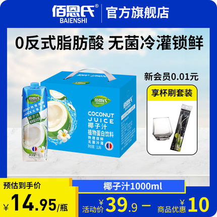 新鲜椰子生榨,低钠减盐配方,钠含量仅28mg/100ml,不加香精,不加任何防腐剂,保留植物蛋白,口感清爽顺滑。目前天猫佰恩氏旗舰店1L*2瓶售价¥39.9,可使用¥20优惠券,实付¥19.9包邮,口感细腻,营养丰富,孕妇、宝宝放心喝。