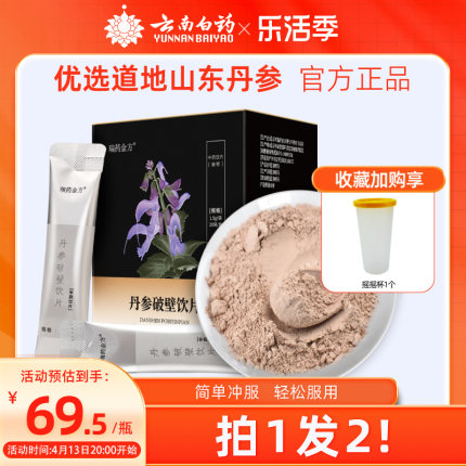 拍1发2,到手2盒,云南白药养生丹粉,自然本色,无硫熏,精选丹参,品质更放心,爸妈吃了吸收效果好,养生调理自然好~目前天猫商城云南白药旗舰店售价¥159.6,拍1发2,下单立减叠加¥40优惠券,双重优惠实付¥98.86包邮,折合¥19.5/盒,赠摇摇杯。