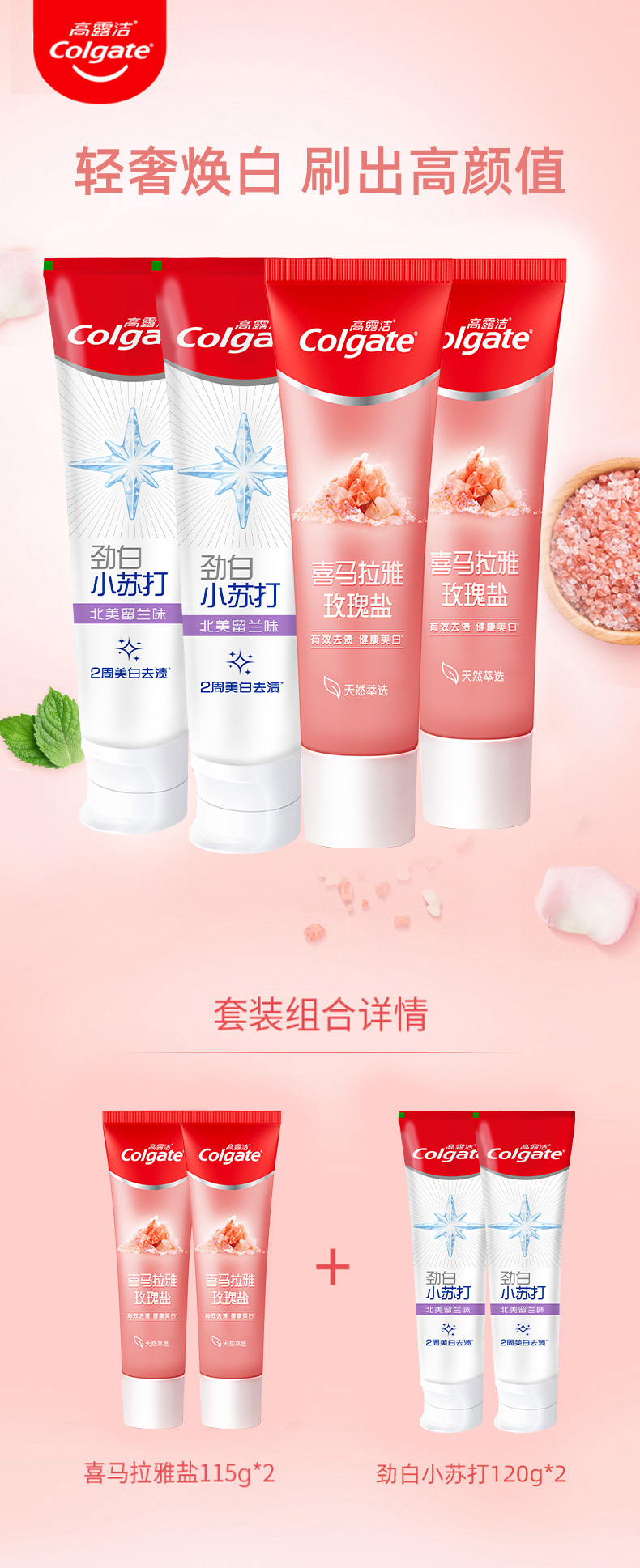 59¥ CZ3457 X8tFdmiR81Q¥ https://m.tb.cn/h.UFWWth5 高露洁喜马玫瑰粉盐天然亮白牙膏劲白小苏打去渍家庭装清新口气