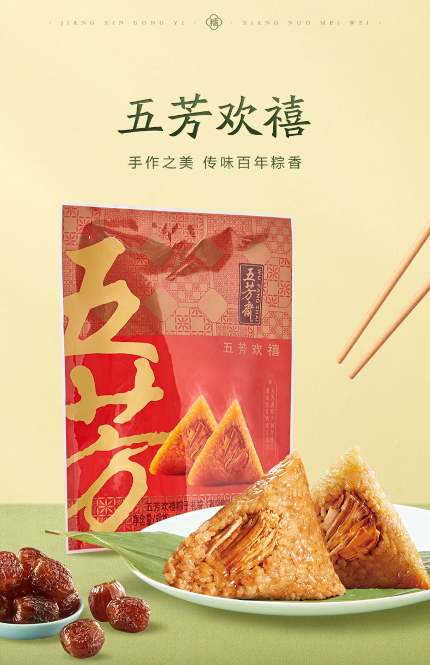 五芳斋号称“江南粽子大王”,是具有百年历史的的中华老字号,获国家质检总局国家地理标志(原产地)注册的产品,以糯而不烂、肥而不腻、肉嫩味美、咸甜适中而著称。