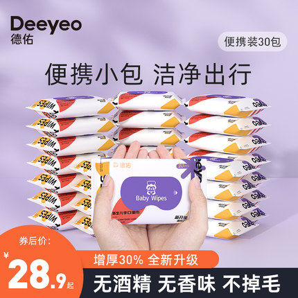 德佑婴儿湿巾小包随身装30包,婴幼儿新生宝宝手口专用便携湿纸巾,干净卫生,清洁护肤,面面俱到,选用天然优质棉,不掉毛,耐拉扯,无香味,无酒精,无添加,安全无刺激,入口也不担心
