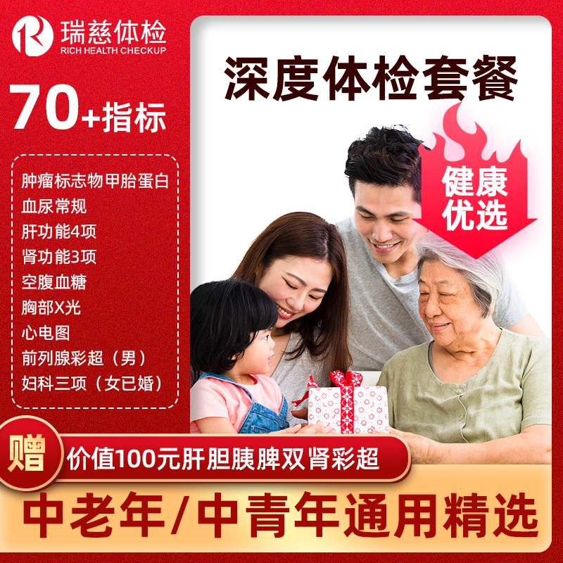 内含升级肿瘤标志物检查 甲胎蛋白AFP,有需要可入送父母,关注父母健康。瑞慈健康全身深度体检套餐,全国多门店通用,支持售中未使用退款及过期自动退款、过期可联系客服延期。目前天猫商城瑞慈体检旗舰店售价¥1079,领取¥800优惠券,实付¥279,拍下填写手机号码。全国29个省市适用,可直接预约最近的体检中心使用。内含升级肿瘤标志物检查 甲胎蛋白AFP、一般检查、内科、外科、血常规18项、尿常规16项、空腹血糖、妇科(已婚项目)、心电图、腹部彩超等多款经典项目,活动下单赠肝胆胰脾双肾彩超,检测非常全面,中老年是高发病年龄,早发现早治疗,成本最低。
