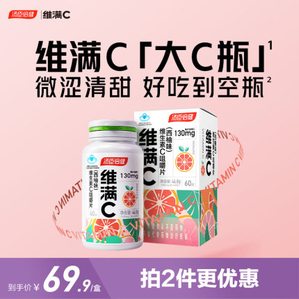 汤臣倍健高端系列,蓝帽子认证,1片补维C ,每片含130㎎维C,活力加分。目前天猫商城健力多官方旗舰店售价¥69.9,满139.8减54.9,领¥25优惠券,下单2件,实付¥39.9包邮,折合¥19.95/瓶史低好价。