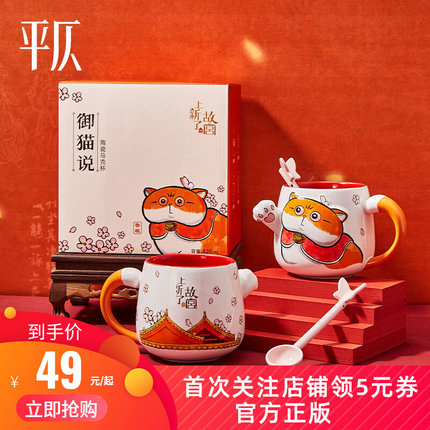 鲁班马克杯 ,故宫元素,御猫造型。目前淘宝企业店铺平仄官方直营店 售价¥48.9,叠加使用¥29优惠券,实付¥19.9包邮,带勺,礼盒装。