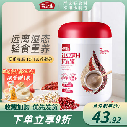 红豆薏米枸杞粉焕新版,配方升级,远离湿态, 轻食重养。目前天猫商城燕之坊旗舰店售价¥48.8,下单9折,可使用¥14优惠券,实付¥29.92包邮,内含薏米成份,孕妇不能服用。