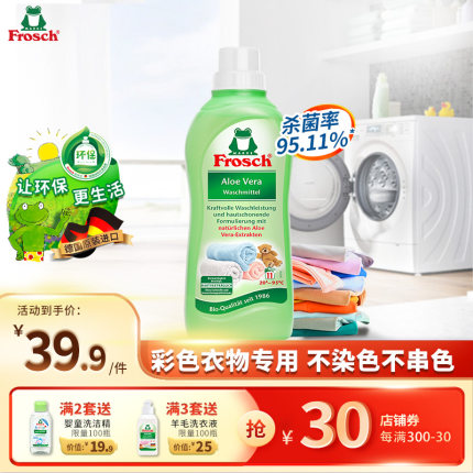 德国原装进口,三重洗净酵素全面释放洁净能量,萃取库拉索芦荟精华,洁净衣物,温和杀菌,杀菌率95.11%,守护家人健康,可食用库拉索芦荟,亲肤温和,给肌肤健康守护,柔顺因子抚顺纤维,维持织物柔软,洗后衣物不发硬。目前这款洗衣液750mL规格天猫商城frosch家居旗舰店售价¥39.9,叠加¥27优惠券,券后实付¥12.9包邮,好价可入。