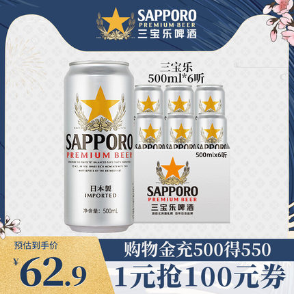 临期低价,Sapporo 三宝乐 日本风味 札幌啤酒500mL*6听34.9元包邮