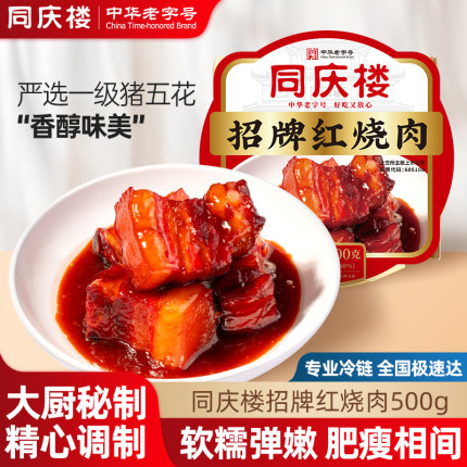 门店堂食一份¥158!同庆楼四大招牌菜之一,线下54+门店内堂食+外卖订单销量第一的菜品。大厨匠心研制,传承名厨配方,干净配料,大酒店级美味配送到家,据说味道跟饭店一模一样哦。目前天猫同庆楼旗舰店售价¥74.87,满1件8折,叠加¥10优惠券,下单实付¥49.9包邮,专业冷链运输,全国极速达,速享美食,线上更划算!PS:本款红烧肉偏甜口,大部分买过的网友都说跟门店一样的口味,介意慎拍!同庆楼 四大招牌菜之一红烧肉 500g,严选一级猪五花肉,肥瘦相间,层次有5层及以上瘦肉,肥瘦分布均匀,比普通三层瘦肉的猪五花口感更细腻,大厨秘制配方,反复调整配料搭配,色香味香醇味美,自己在家加热就能享受门店同款美味,免洗免切,非常省心。