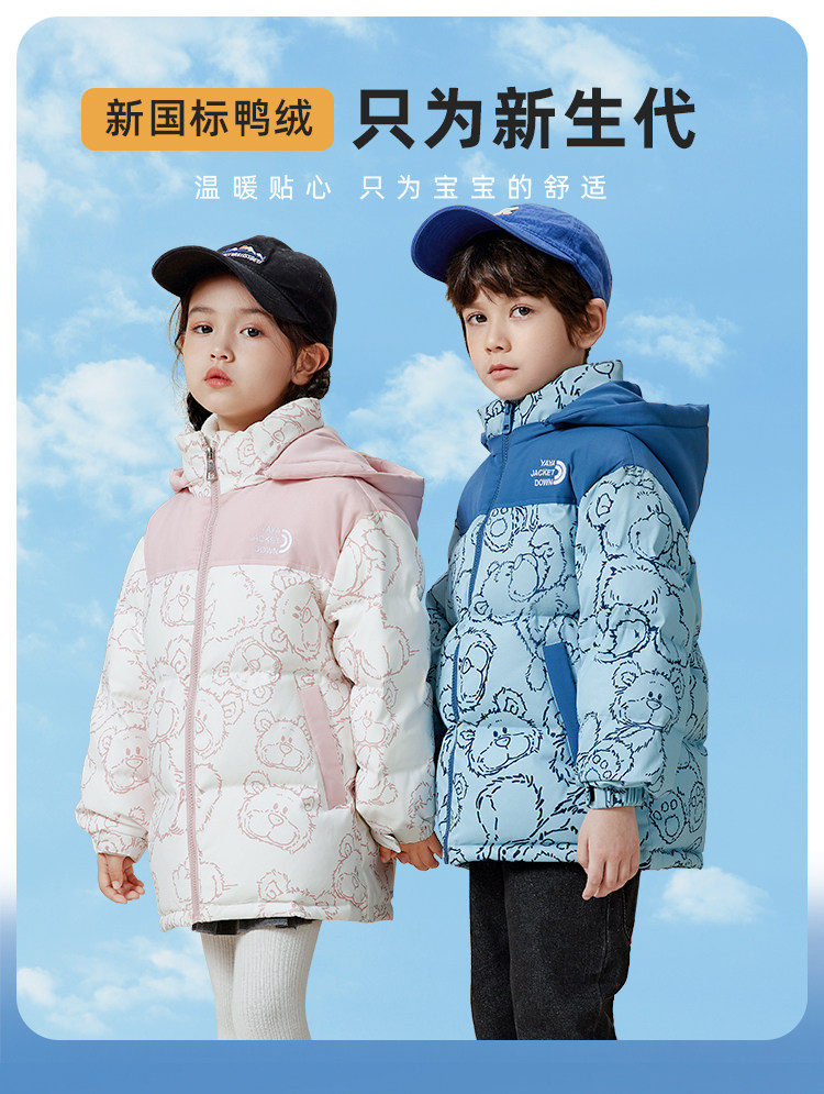 鸭鸭 儿童90%白鸭绒时尚印花羽绒服YE2B807403K,甄选4A级防水面料,防污耐脏,防刮耐磨,内充优质新国标白鸭绒,90%含绒量,厚实保暖无异味。合体版型,可拆卸连帽设计,袖口、下摆弹力收口,贴合舒适防止冷风钻入,卡通熊印花设计,百搭时尚,男女童都能穿。