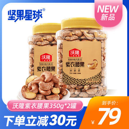 紫衣腰果,挑选AAA级超级大腰果,原香带皮,更大更饱满。目前天猫商城坚果星球旗舰店350g*2罐售价¥109,下单立减叠加领取¥10优惠券,双重优惠实付¥68.92包邮,入手好价。AAA+级,180粒/磅数字越小,颗粒越大。