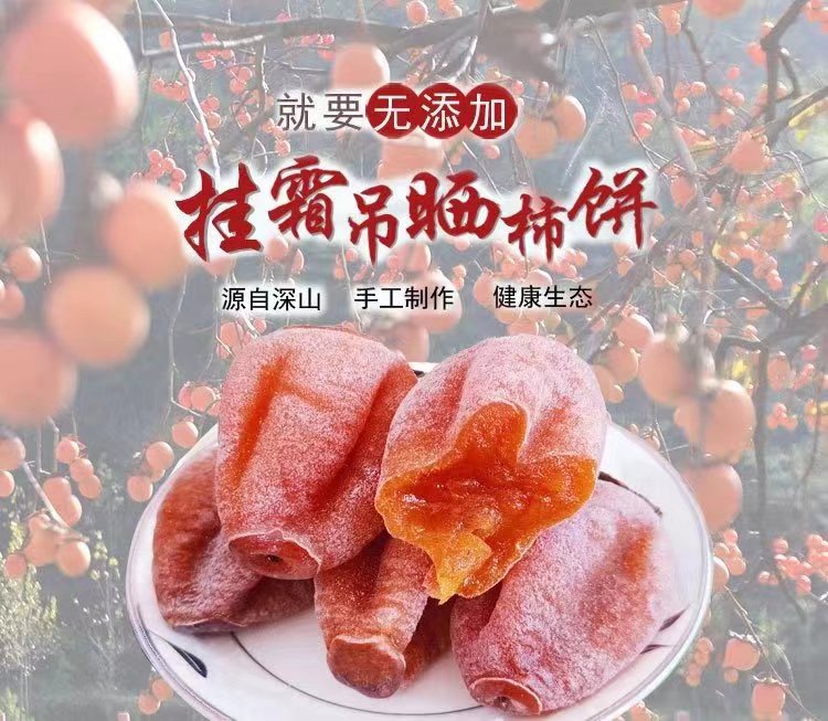 前两个选项可拍,开袋即食,都是独立小包装的,干净又卫生。源自深山柿子,山区土地无需化肥农药,手工采摘,柿饼果肉醇厚,肉质软糯,颜色橘红,表面自然果霜,有很高营养价值,香甜软糯。