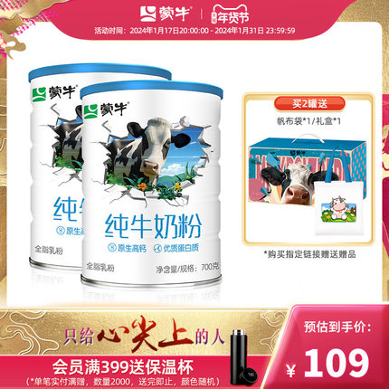 礼盒装,赠帆布袋款可选,送人很巴适。配料表只有生牛乳,8倍浓缩,优质蛋白质,原生高钙,泡出来就是一杯纯牛奶,口感纯粹,全家都可喝。目前天猫商城蒙牛奶粉旗舰店700g*2罐售价¥129,下单立减叠加¥10优惠券,实付¥99包邮,2款包装可选。