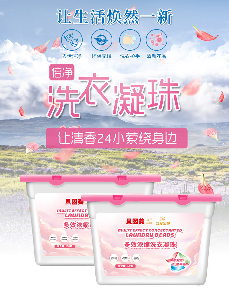 旗舰店活动,家庭装100颗,温和配方,平均¥0.17/颗,添加天然酵素成分,三倍洁净,深入衣物纤维,去除多种有害细菌,去污效果更强。萃取植物香氛因子,持久留香,PH值介于7.0-7.5之间,温和不刺激,婴幼儿衣物也可放心洗。