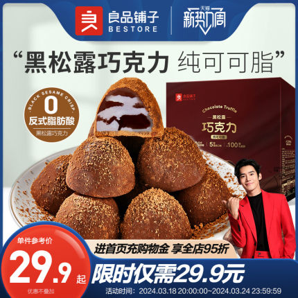 之前29.9元,降10元白菜价!黑松露巧克力,纯可可脂,0反式脂肪酸,浓郁丝滑,入口即化。目前天猫商城良品铺子旗舰店售价59.9元,下单立减30元,领取10元优惠券,实付19.9元包邮,新低价。