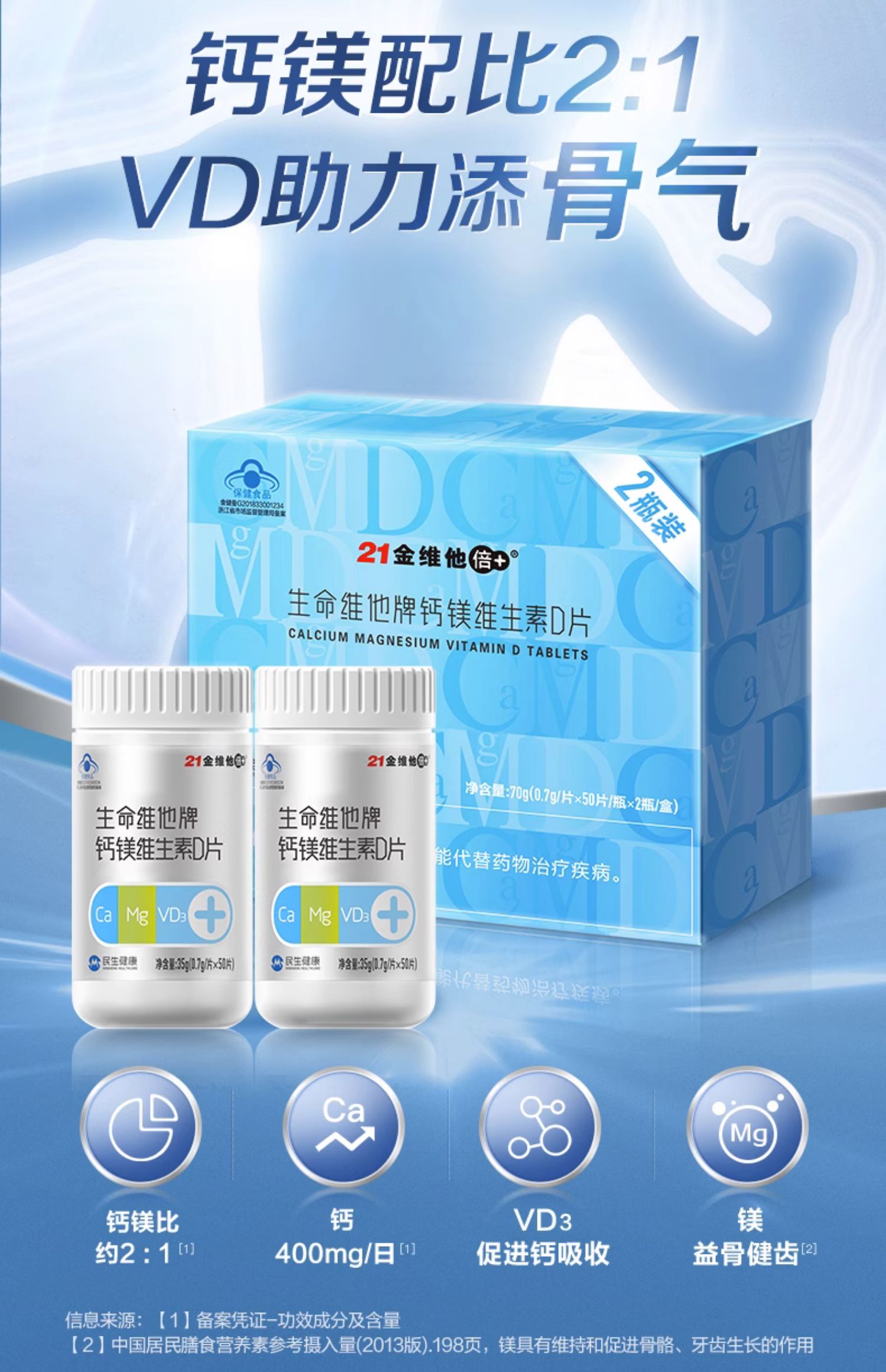 这款 民生 21金维他 钙镁维生素D片,每片含100mg钙、50.4mg镁、1.5ug维生素D,适合11岁以上缺失这几种元素者使用,咀嚼吞服,使用方便更易吸收。