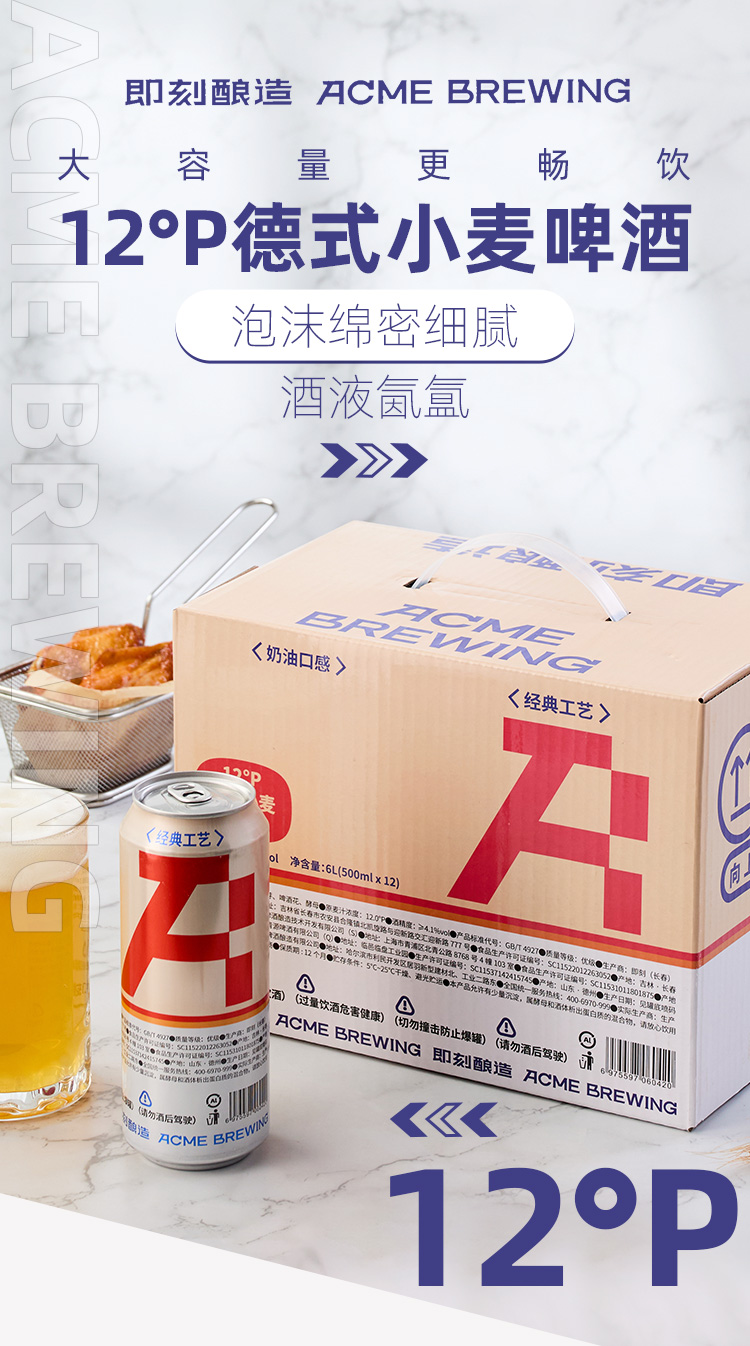 ACME Brewing 即刻酿造 12°P德式小麦啤酒,采用艾尔上层发酵法离心工艺,留存少许酵母和凝固蛋白成分,保留啤酒原有风味。浓郁的麦芽香,独特的酵母香。口感绵密,苦味内敛,爽口解渴,回味悠长。