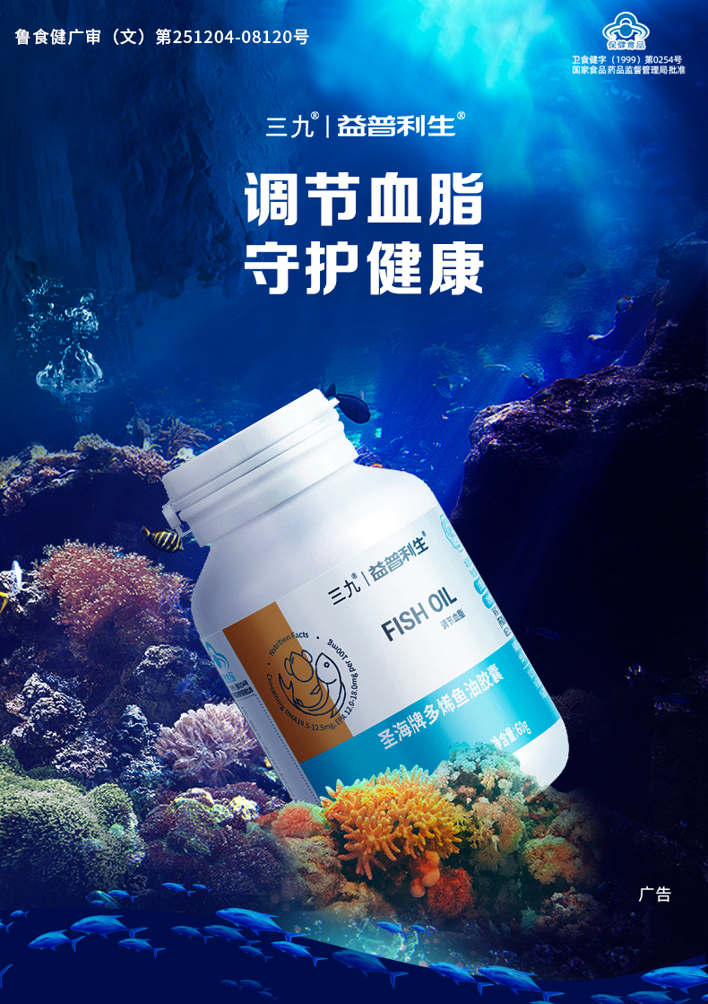 999 三九医药 益普利生牌 多烯深海鱼油软胶囊60粒,源自秘鲁深海大型海洋鱼类的身体,其主要成分为OMEGA-3脂肪酸(包括DHA和EPA),是一种多元不饱和脂肪酸;每100mg含EPA12~18mg,KHA10.5~12.5mg;具有调节血脂的保健功能,适合血脂偏高人群服用。