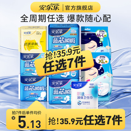 纤巧245mm*10片、超薄245mm*10片、瞬吸液体极薄245mm*2片*2包、超薄420mm*4片、安睡裤2条*1包等全规格都有,1.2D亲肤面层,触感柔软细腻,上层吸收下层锁流,螺旋式蓝芯片,瞬吸不黏腻。