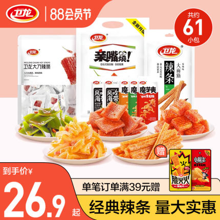 三个组合可选,亲嘴烧混合装、大面筋香辣味、大刀辣条香辣味、风吃海带、多口味魔芋爽等都有,最多到手63小包,平均¥0.26/包,具体参考图片,都是经典口味,休闲磨牙可以安排一点。