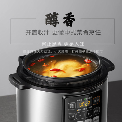 美的电压力5L双胆电饭煲,加深内胆炖煮,一锅双胆不串味,拨动式排气,3种口感可选,15大功能面板,去腥提鲜技术,70KPA高压快煮更快入味,居家必备!