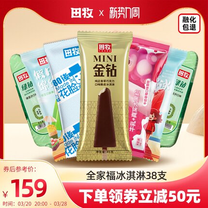 田牧全家福冰淇淋,含6种口味鲜奶冰淇淋、MINI金钻巧克力脆皮、银钻青柠味等,添加生牛乳,融化包赔,深冷护航。目前天猫商城田牧旗舰店38支组合装售价¥209,每200减30,叠加可使用¥90优惠券,实付¥89包邮,2款组合可选。