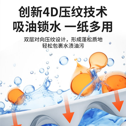 原生木浆,接触食物更安心,创新4D压纹技术,吸油锁水一纸多用。规格:210*195MM*1提。规格360张/提;目前商家售价¥9.99,可使用¥4优惠券,实付¥5.9包邮。吸收力升至7倍,7大油污一抹净,可湿水擦拭搞定粘腻污渍,省时省力,随用随抽~