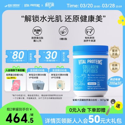 纯净无杂质,0糖0乳无麸质,及时补充身体流失的胶原蛋白肽,可搭配牛奶燕麦咖啡果汁,清排体内毒素,清颜美肤。目前天猫国际567g罐装特价499,叠加40元优惠券,参加每200减30活动,自动领5元红包和36元首购礼金,凑单1件凑单品(可t),实付344.06元包邮新低价。