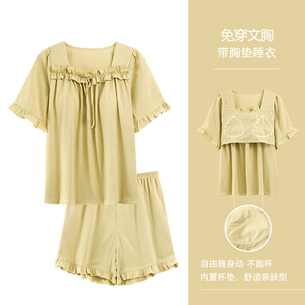 浪莎,云朵棉睡衣,女士夏季薄款带胸垫,花边短袖短裤,可外穿家居服套装!