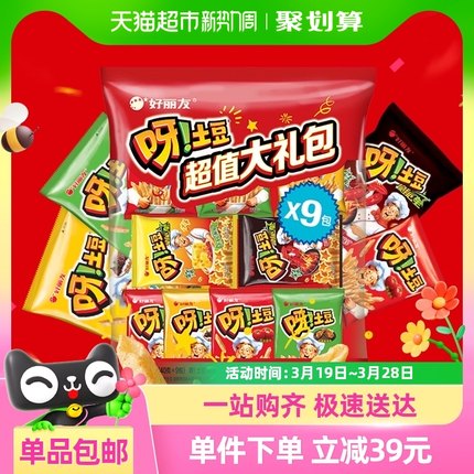 好多鱼蜜香鸡翅味、呀土豆里脊牛排味、呀土豆麻辣小龙虾味、呀土豆滋香烤鸡味、好友趣多汁牛排、Q蒂摩卡、巧克力派、果滋果心等多款热门零食,拍6组,共到手12件,折¥3.08/件,休闲磨牙安排。