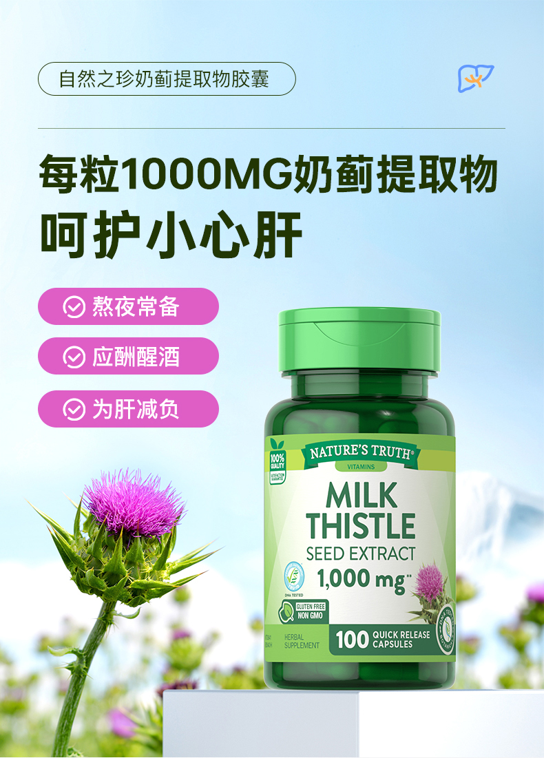 Nature’s Truth 自然之珍 奶蓟草片100粒*2瓶,安全无添加,不含任何人工激素、药品与违禁物质,不含糖,人工色素、香精、防腐剂与致敏物质;每粒含有相当于1000毫克鲜奶蓟的活性物质,以4:1比例提取自天然优质奶蓟,确保含有更多的有效成分并保障活性。每日1粒,每日1~2次。